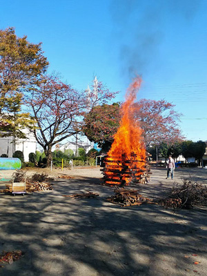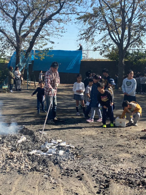 町会や、お祭り会の皆様のご尽力により天まで届く焚き火に!みんな大興奮! 日が落ち着いた頃お芋を入れて焼き芋ができるまでもう少しゲームや絵本の味読み聞かせなどで楽しみます。 ホクホクの甘いお芋に舌鼓。秋の楽しいひとときでした。