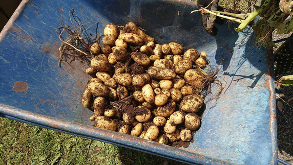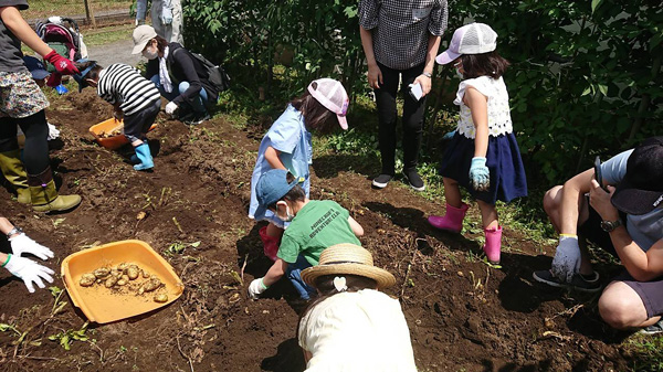 その分、楽しみにしていたジャガイモ掘り。当日はお天気にも恵まれ暑いくらいの気候の中、子供達は夢中でジャガイモ掘りをしました。 ほとんど掘り終わった後は、虫探し。大きな虫が出てきてびっくりする子も。 畑のお世話をしてくださっている方たちのおかげで大きく育ったジャガイモ。 今年は豊作で、たくさんお土産ができました。